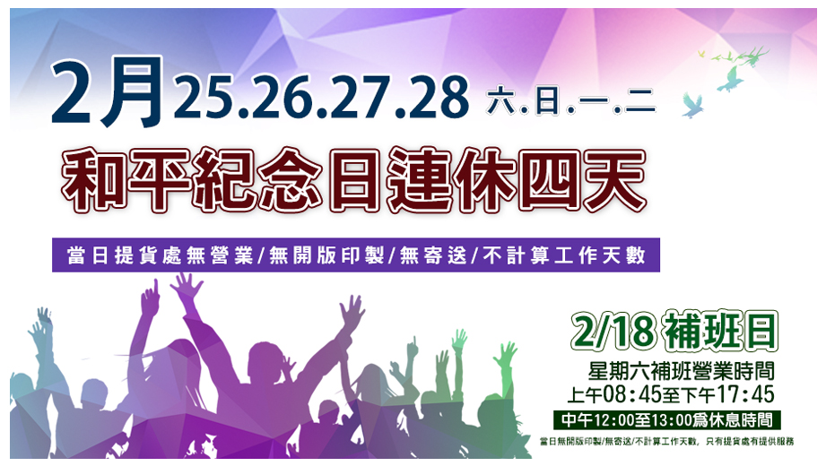 當日皆無營業、無開版印刷、無寄送、不計算工作天數喔!