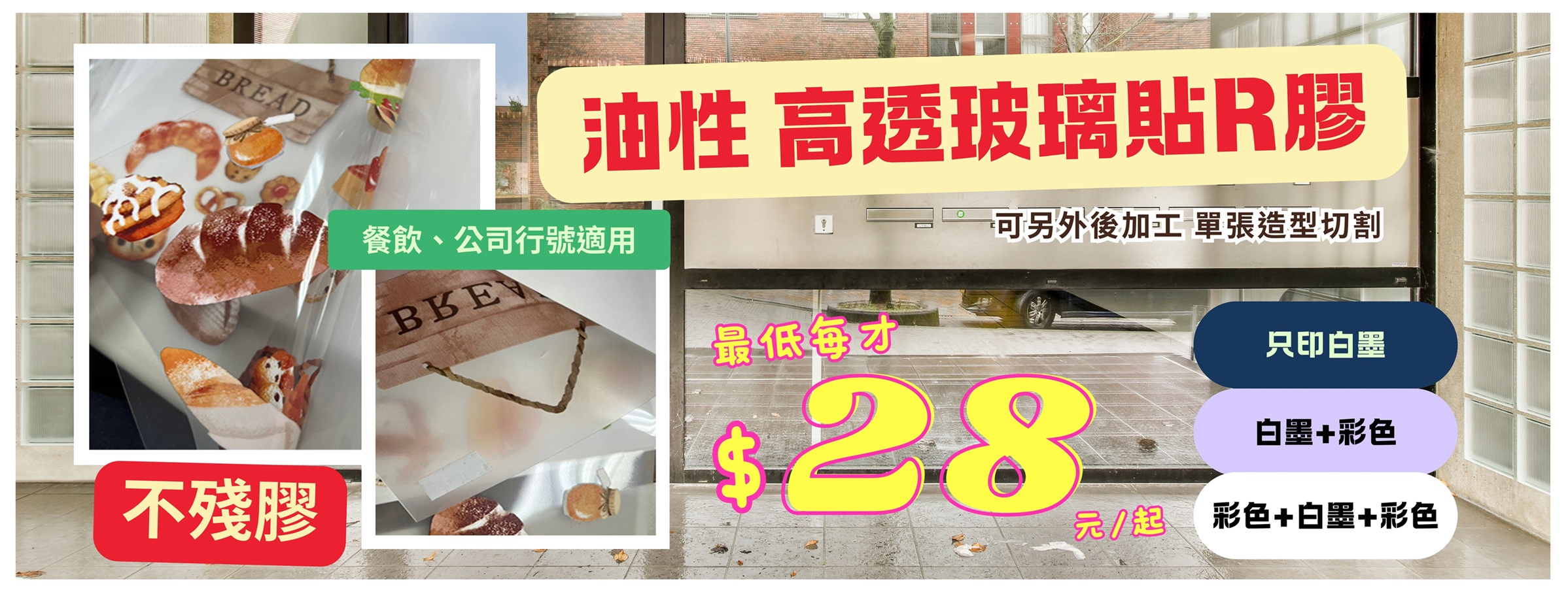 想幫店面玻璃換個新表情嗎~👀💕這款【油性高透R膠玻璃貼】讓你隨心情變換你的外觀✨高透明材質又亮眼,遠看近看都好看😍油性R膠服貼度高,不易翹邊、不殘膠,貼得安心又放心👍💖餐飲門市🍔☕、公司行號🏢、櫥窗展示🪟都超適合!還可單張造型切割✂️,想怎麼可愛就怎麼來🎀價格也很甜🍬,最低每才只要 $28 元起 💰✨白墨🤍、彩色🌈、白墨+彩色✨ 多種印刷方式一次滿足🎨👉油性高透R膠玻璃貼