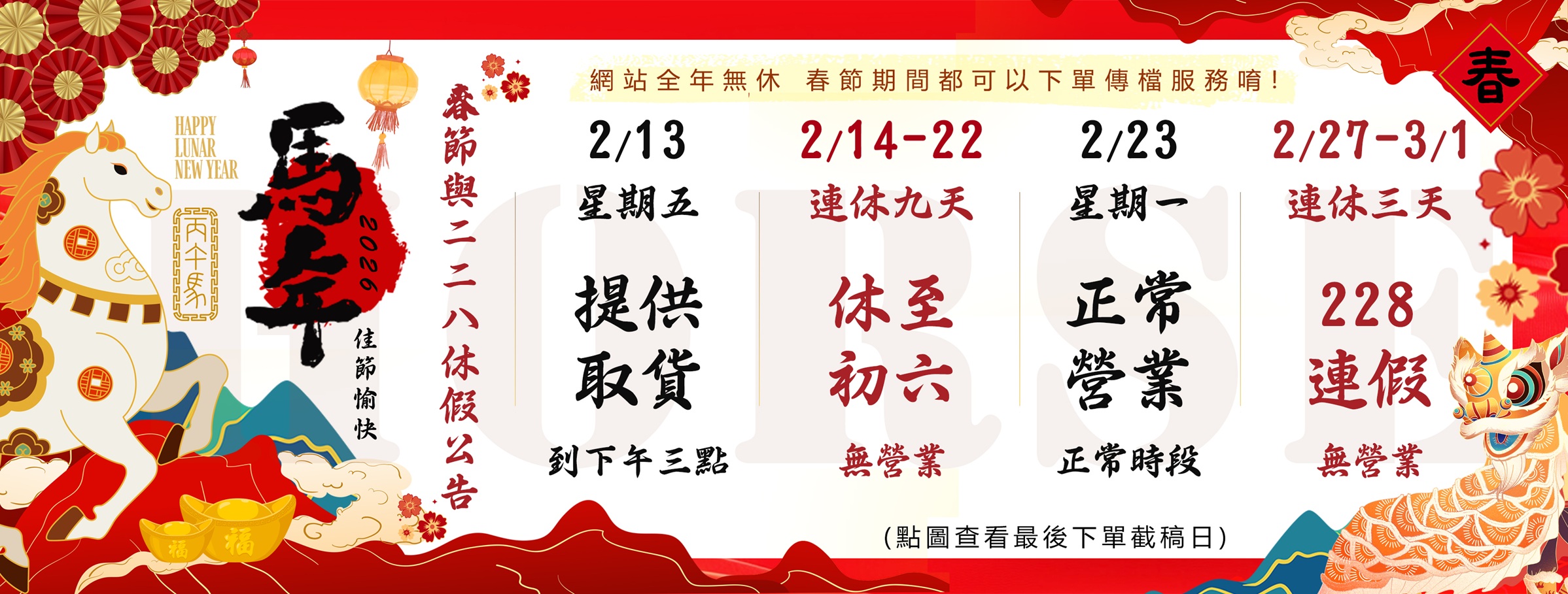 凡是下單後工作天數碰到農曆春節期間都不做計算,2月23日(週一)才會再計算工作天數,請大家再特別注意交期時間喔!🙏