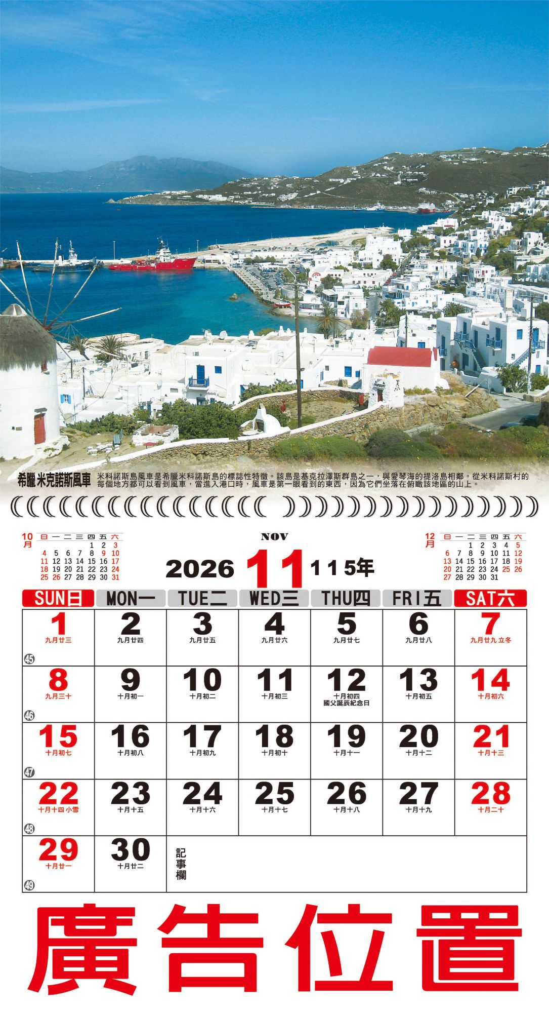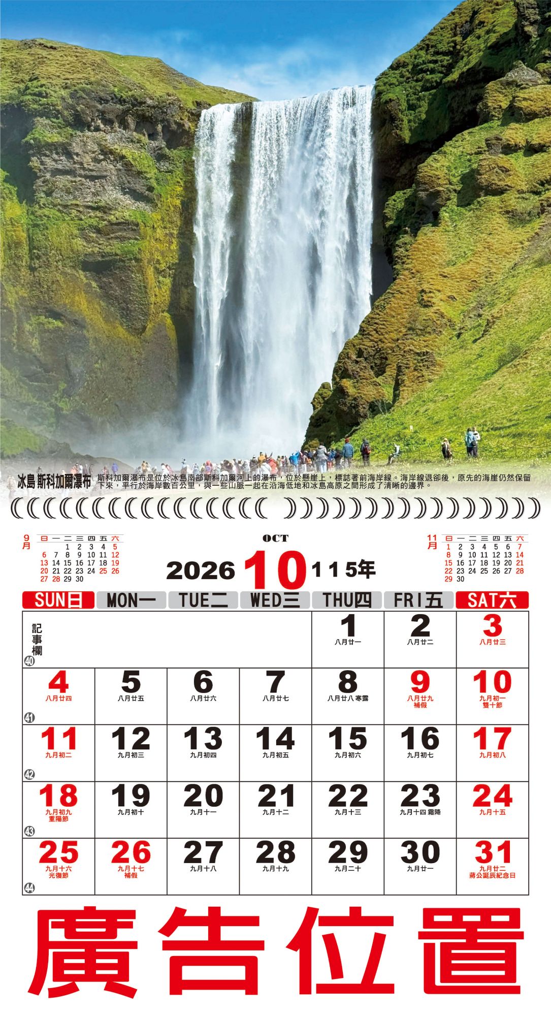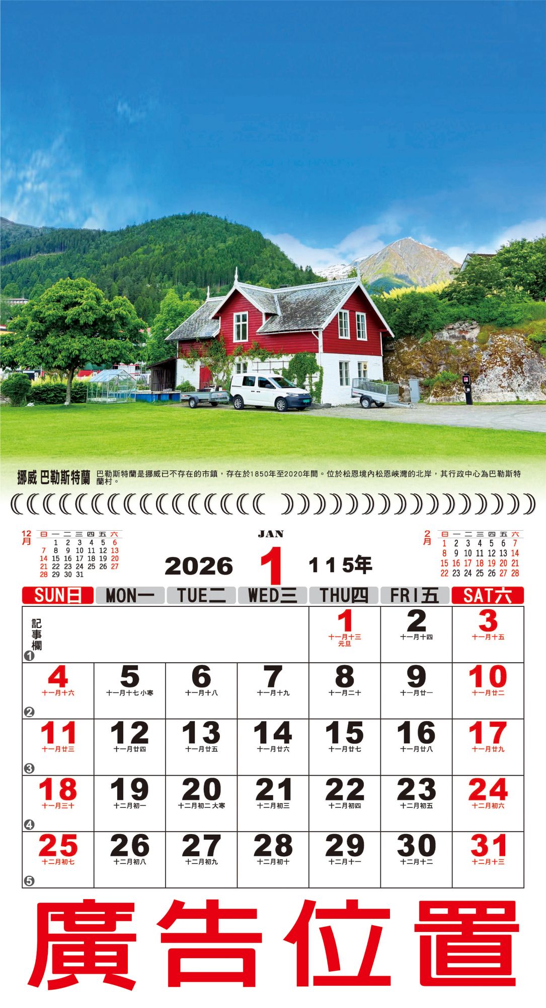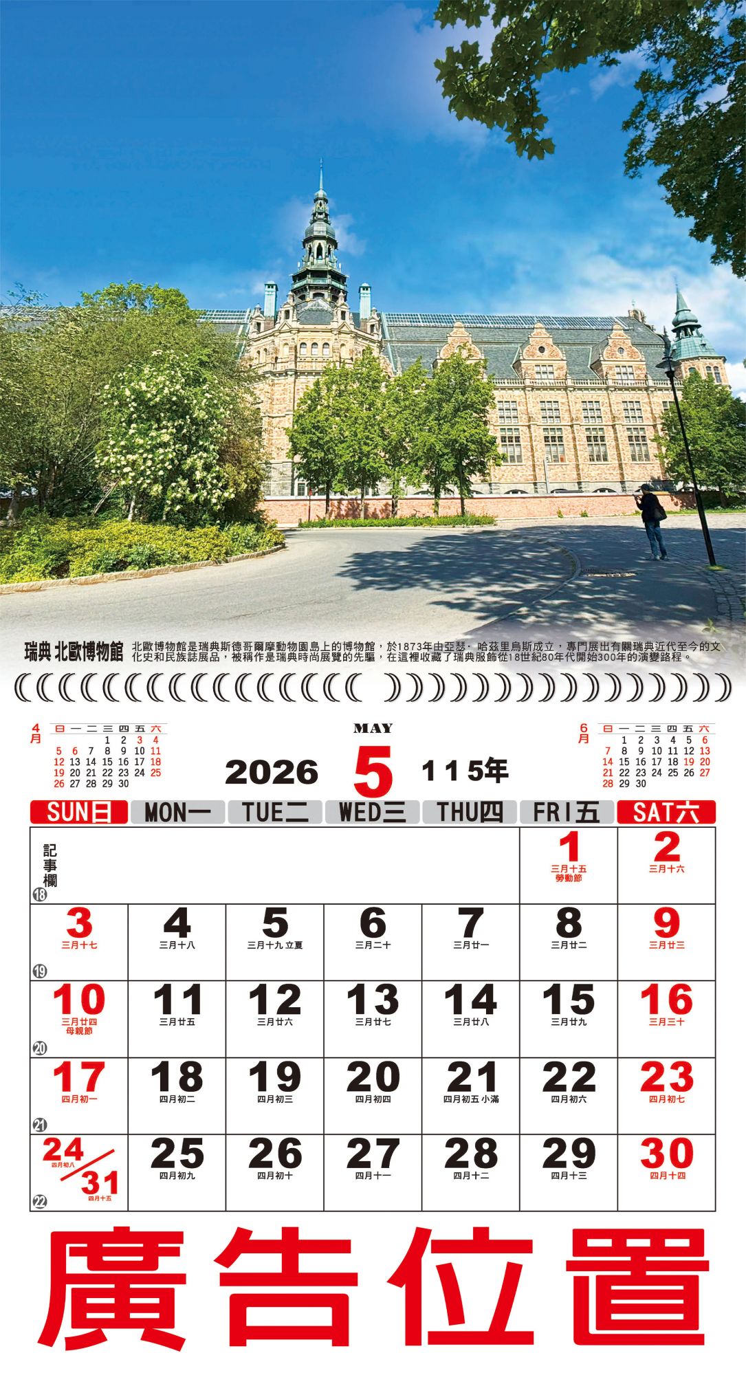 - 商品為傳統式日曆、月曆,產品內的圖片皆是現成公版圖片印刷,無法客製化加入圖片