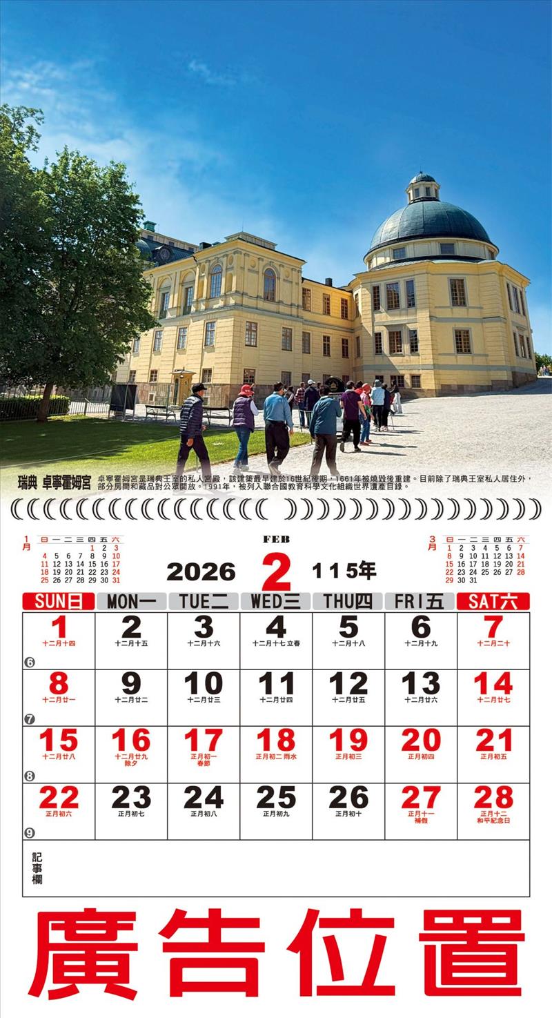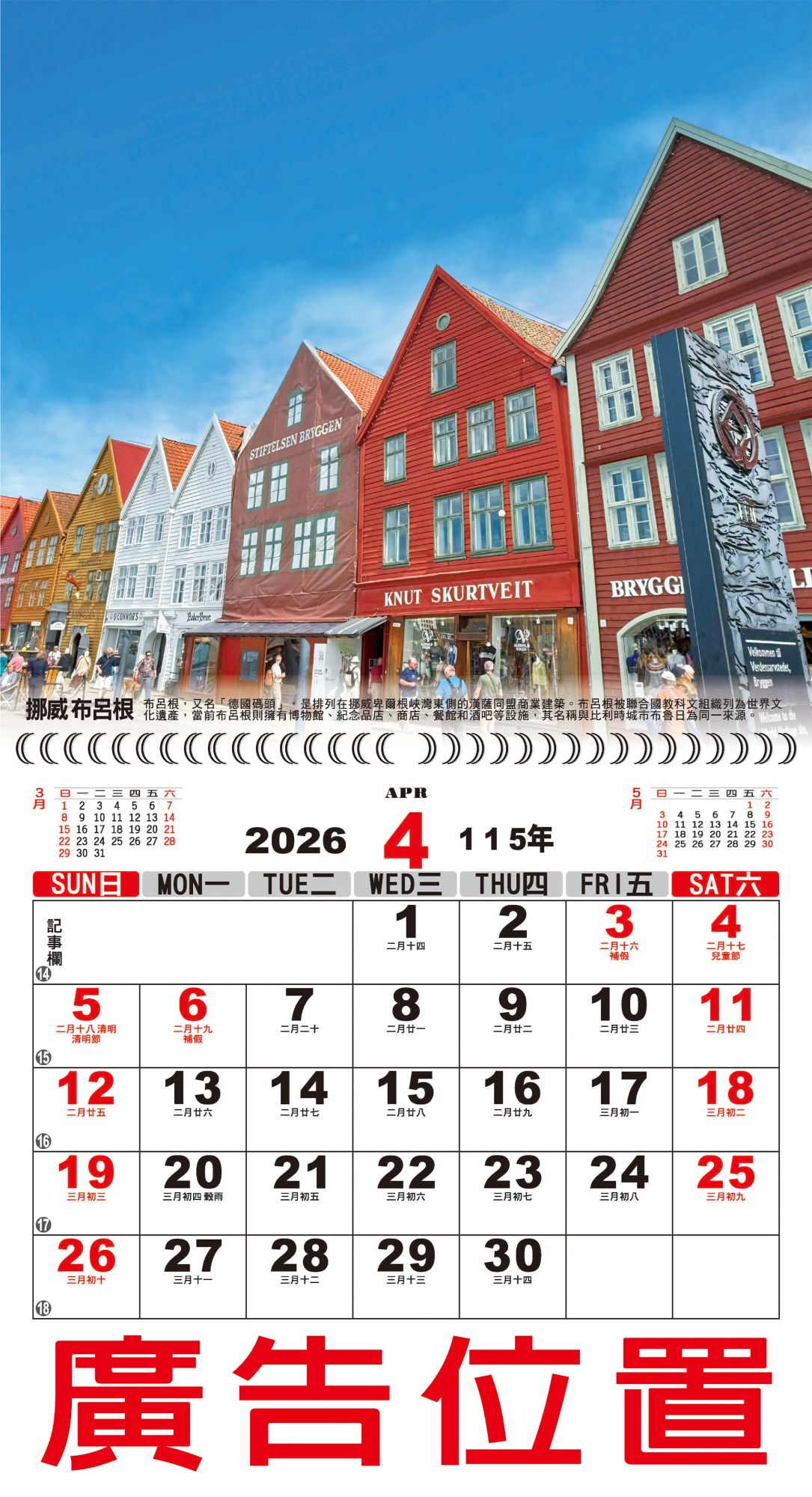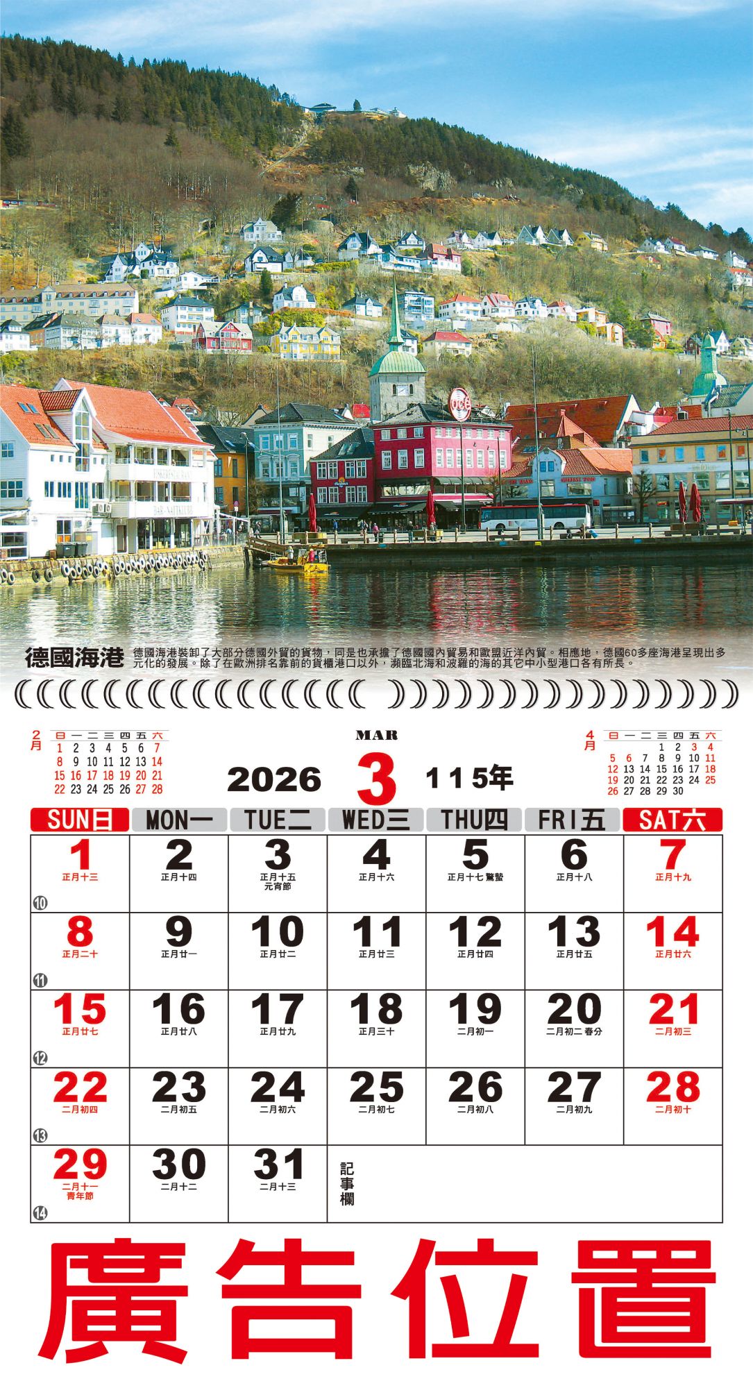 - 商品為傳統式日曆、月曆,產品內的圖片皆是現成公版圖片印刷,無法客製化加入圖片