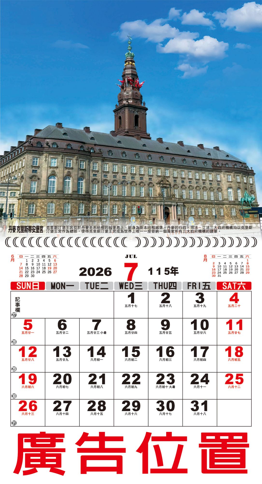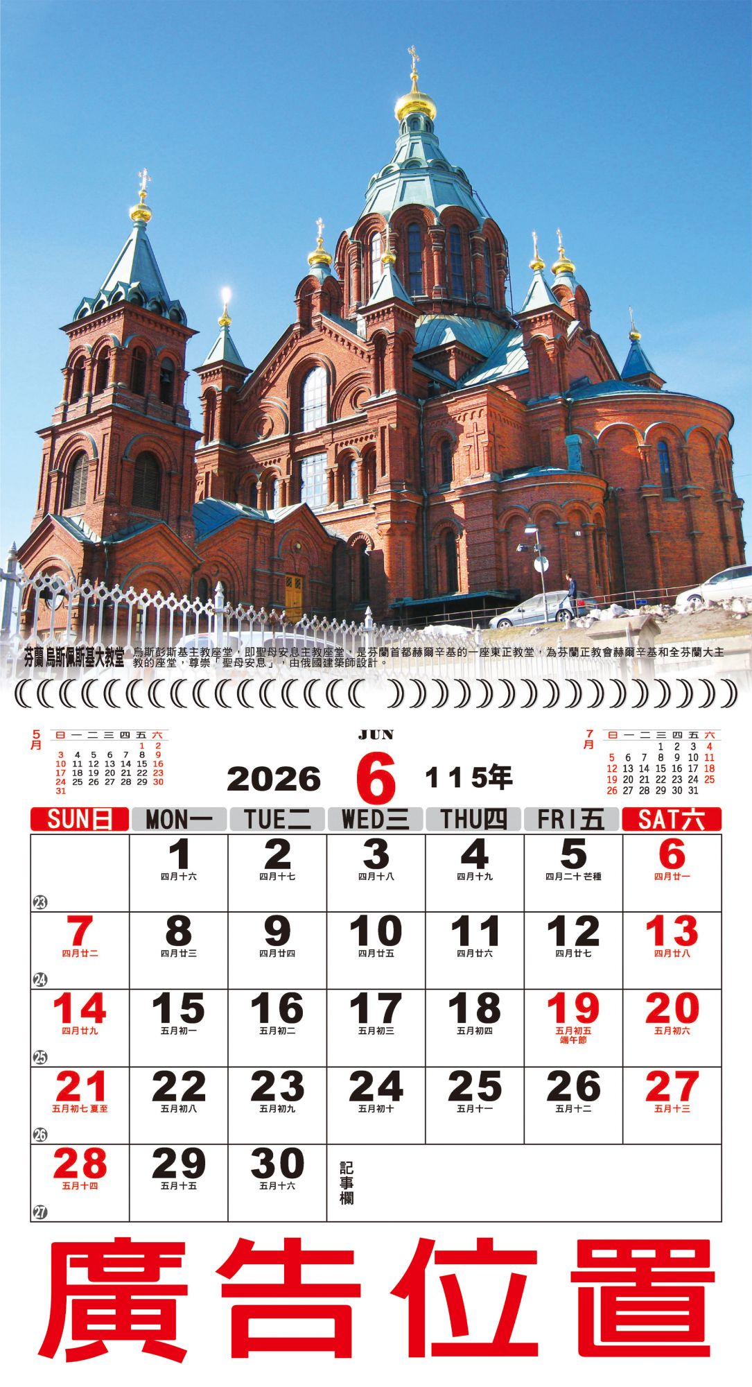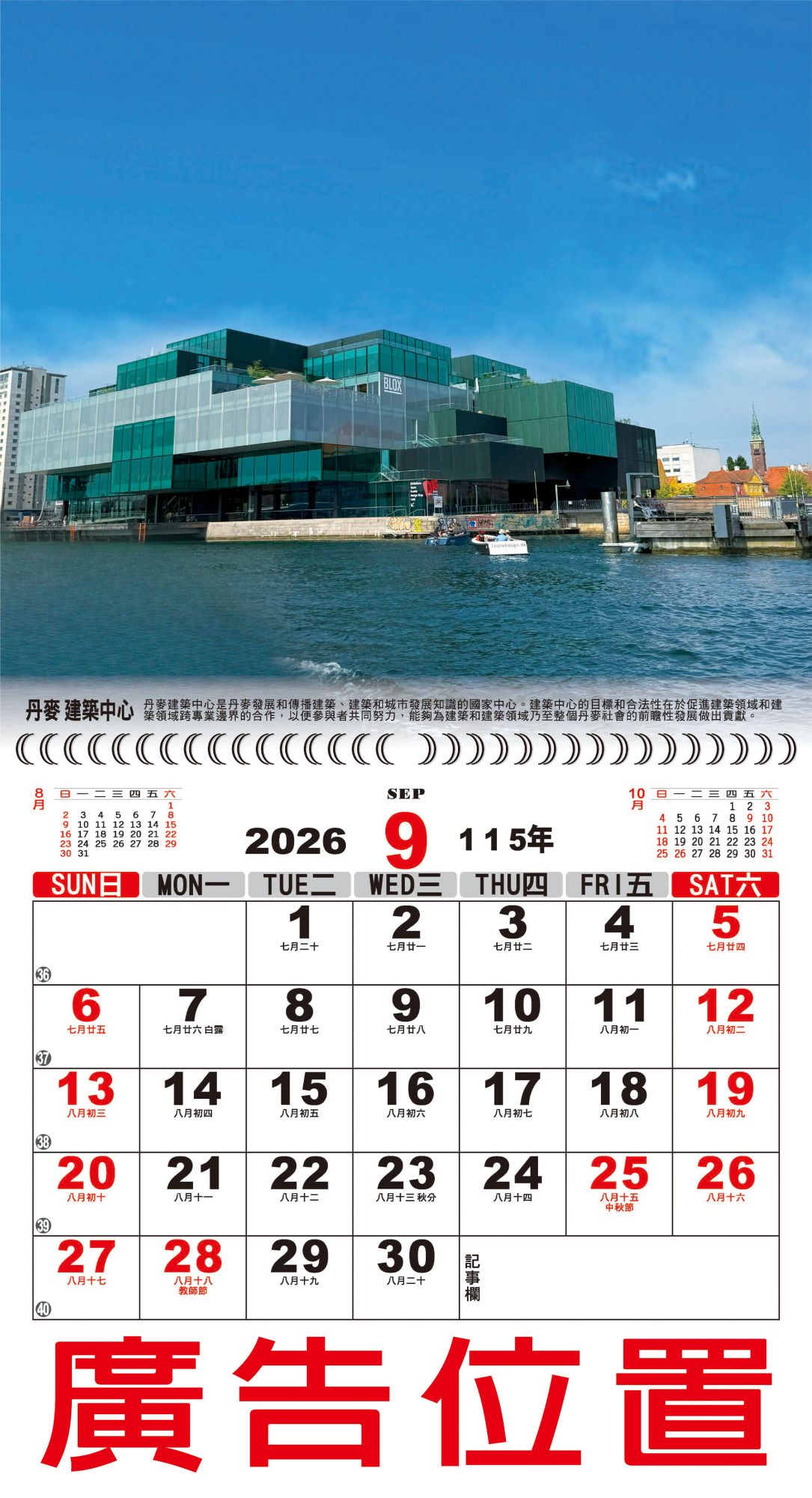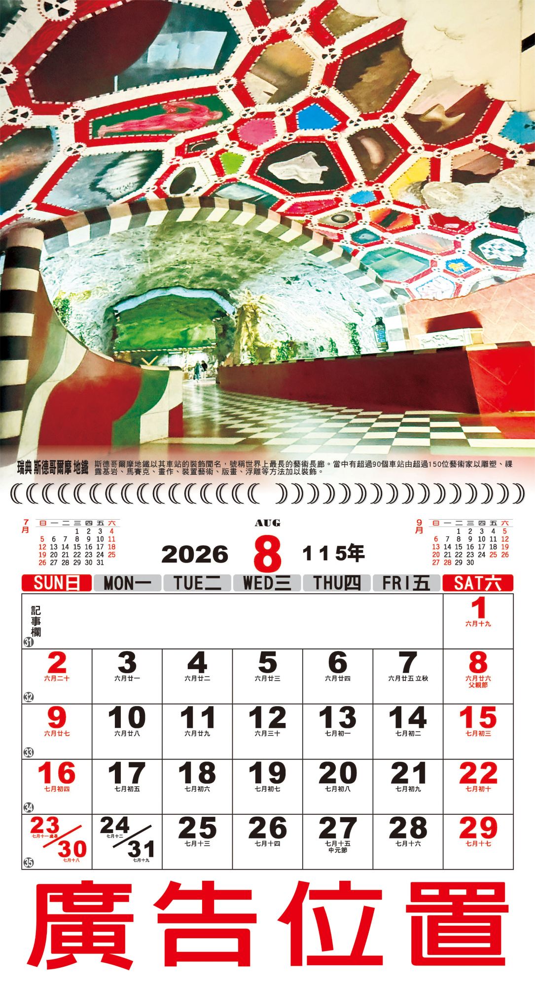 - 商品為傳統式日曆、月曆,產品內的圖片皆是現成公版圖片印刷,無法客製化加入圖片