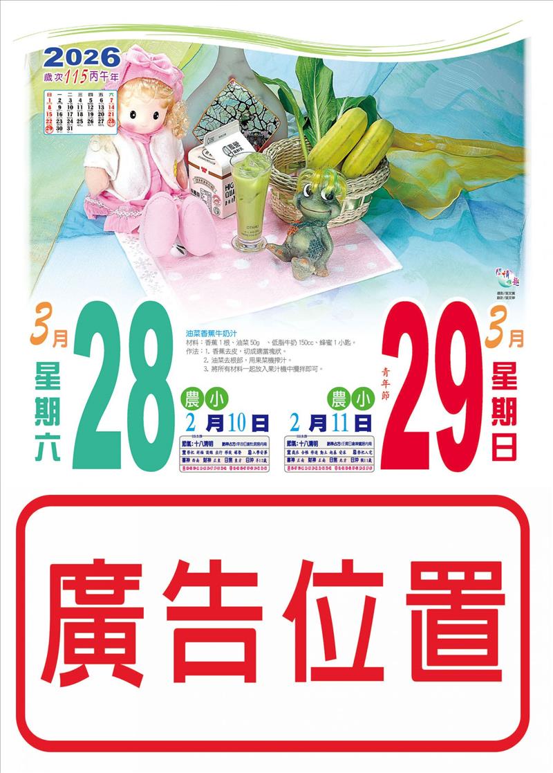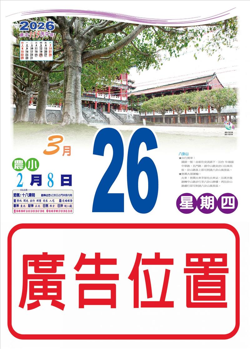 - 商品為傳統式日曆、月曆,產品內的圖片皆是現成公版圖片印刷,無法客製化加入圖片