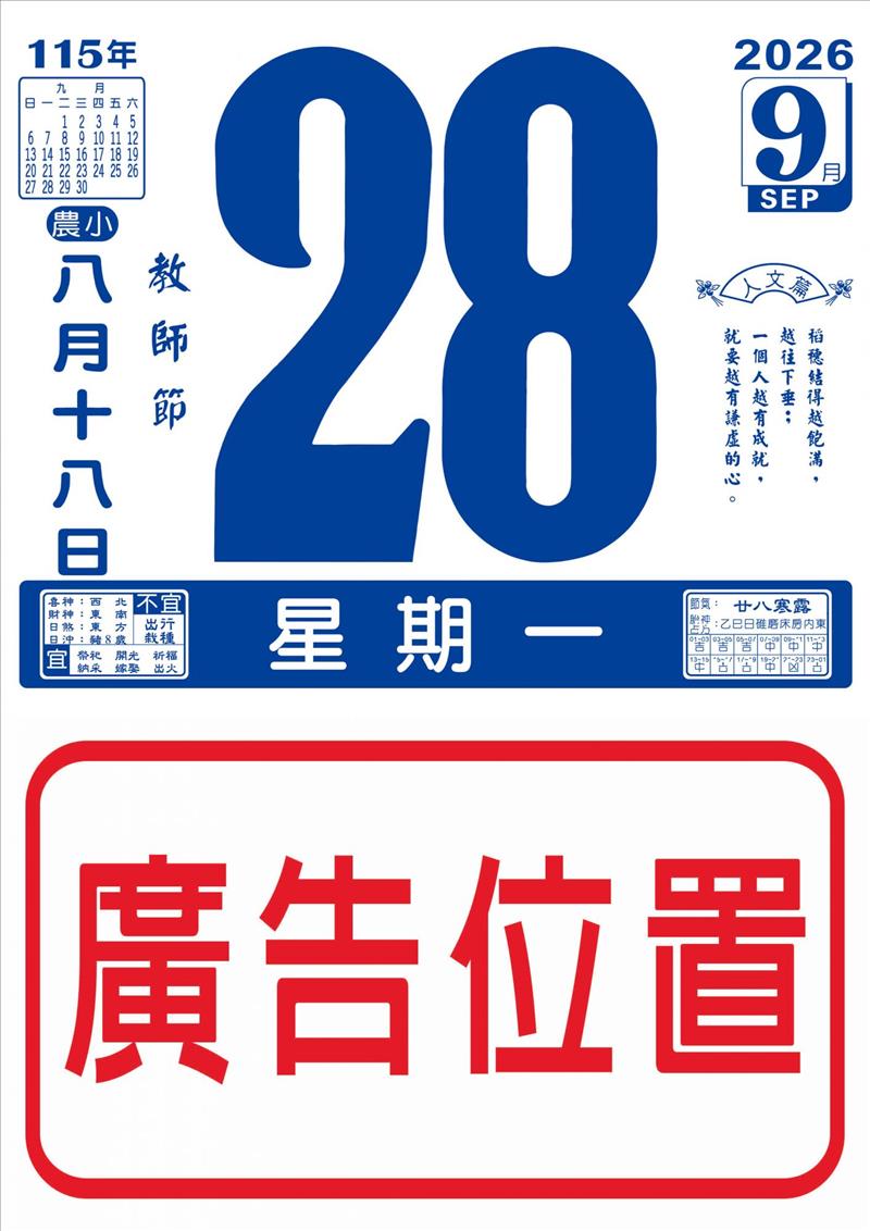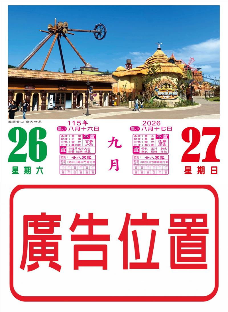 - 商品為傳統式日曆、月曆,產品內的圖片皆是現成公版圖片印刷,無法客製化加入圖片