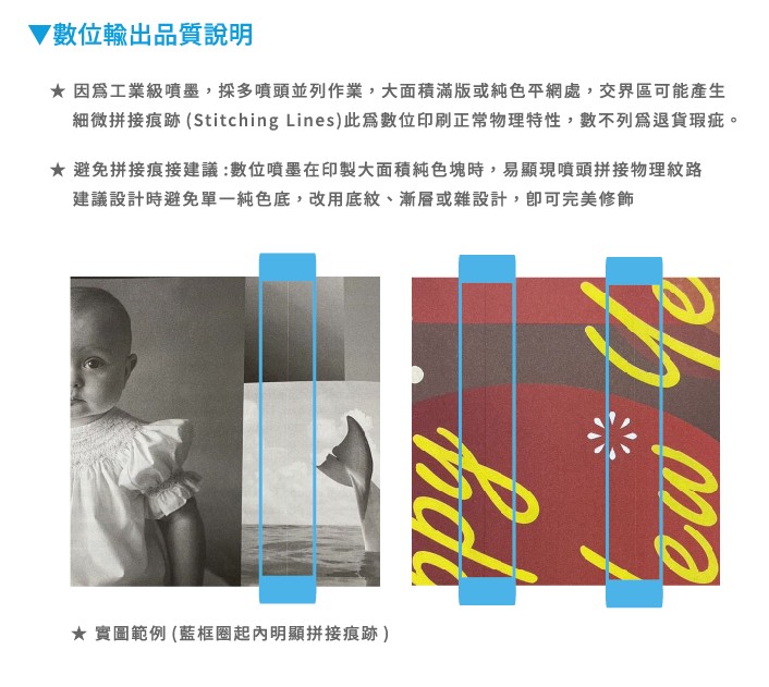 - 數位印刷請勿使用4色黑的填色或者大面積色塊,4色總值相加超過250的填色及大面積色塊,也易造成背印及上膜脫膜,與壓線後脫膜。